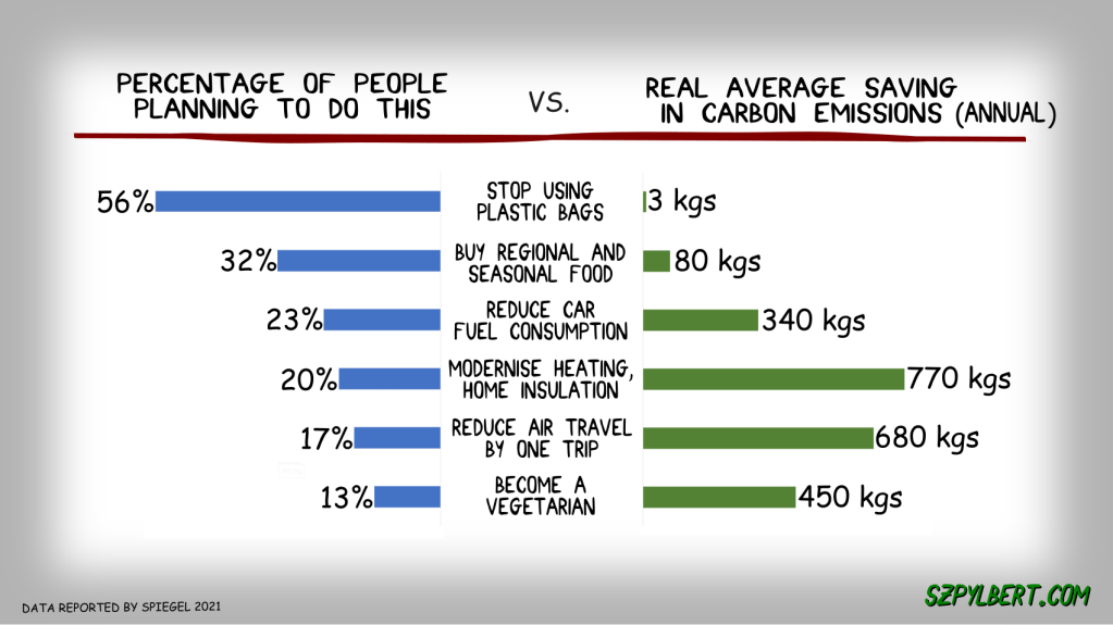Turns out that many people have wildly unrealistic ideas about the effectiveness of their actions to limit carbon emissions. To make a dent in your carbon dioxide emissions do the following: get a new heating system, insulate your home properly, stop eating meat and stop flying if you can avoid it! Did I mention that this is serious?
